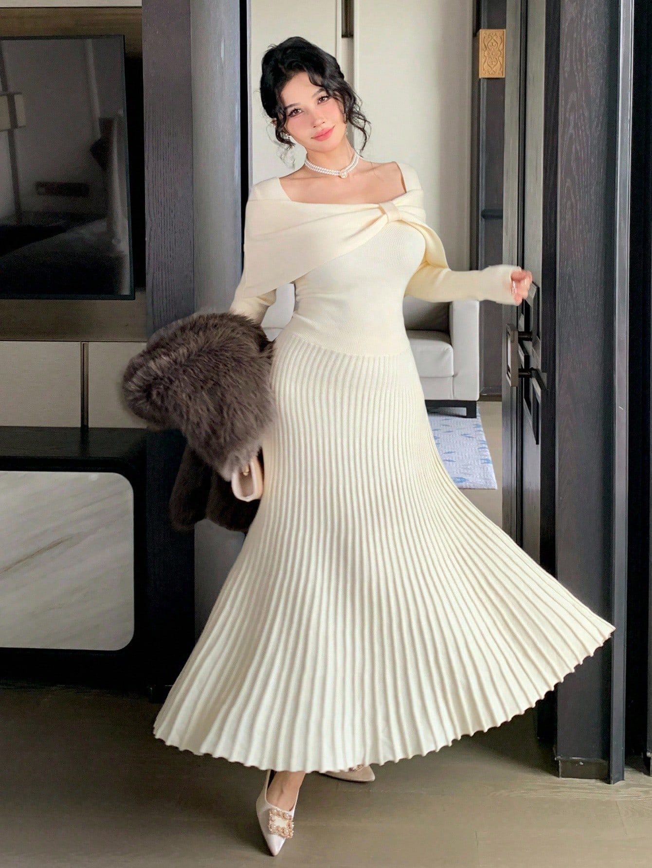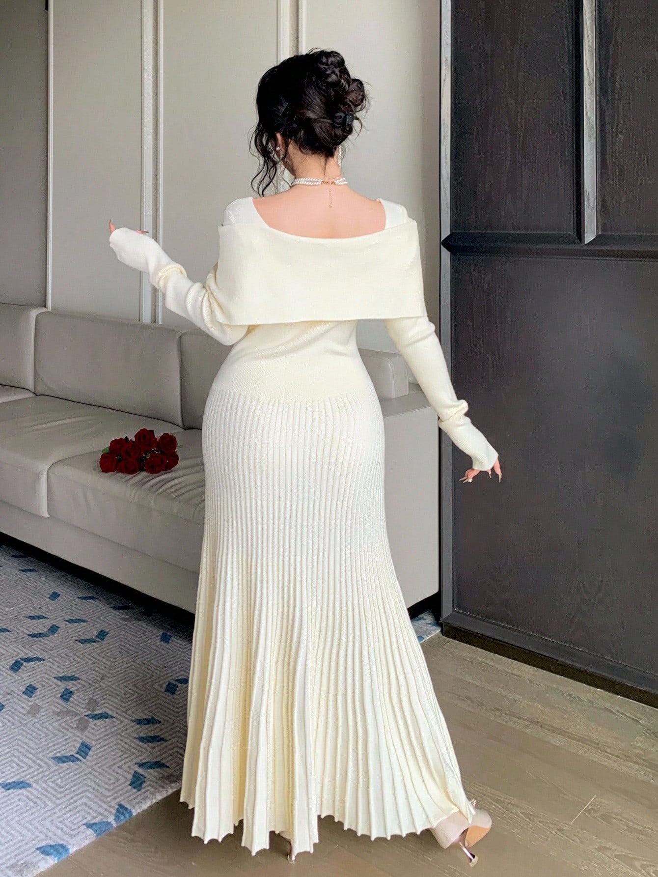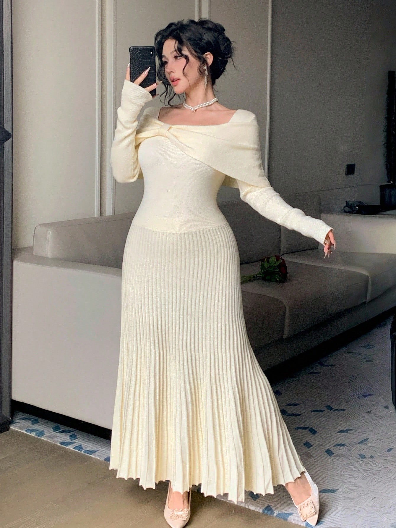 فستان كنزة صوفية أنيق بلون أحادي الرقبة المربعة غير متماثل، خريفي