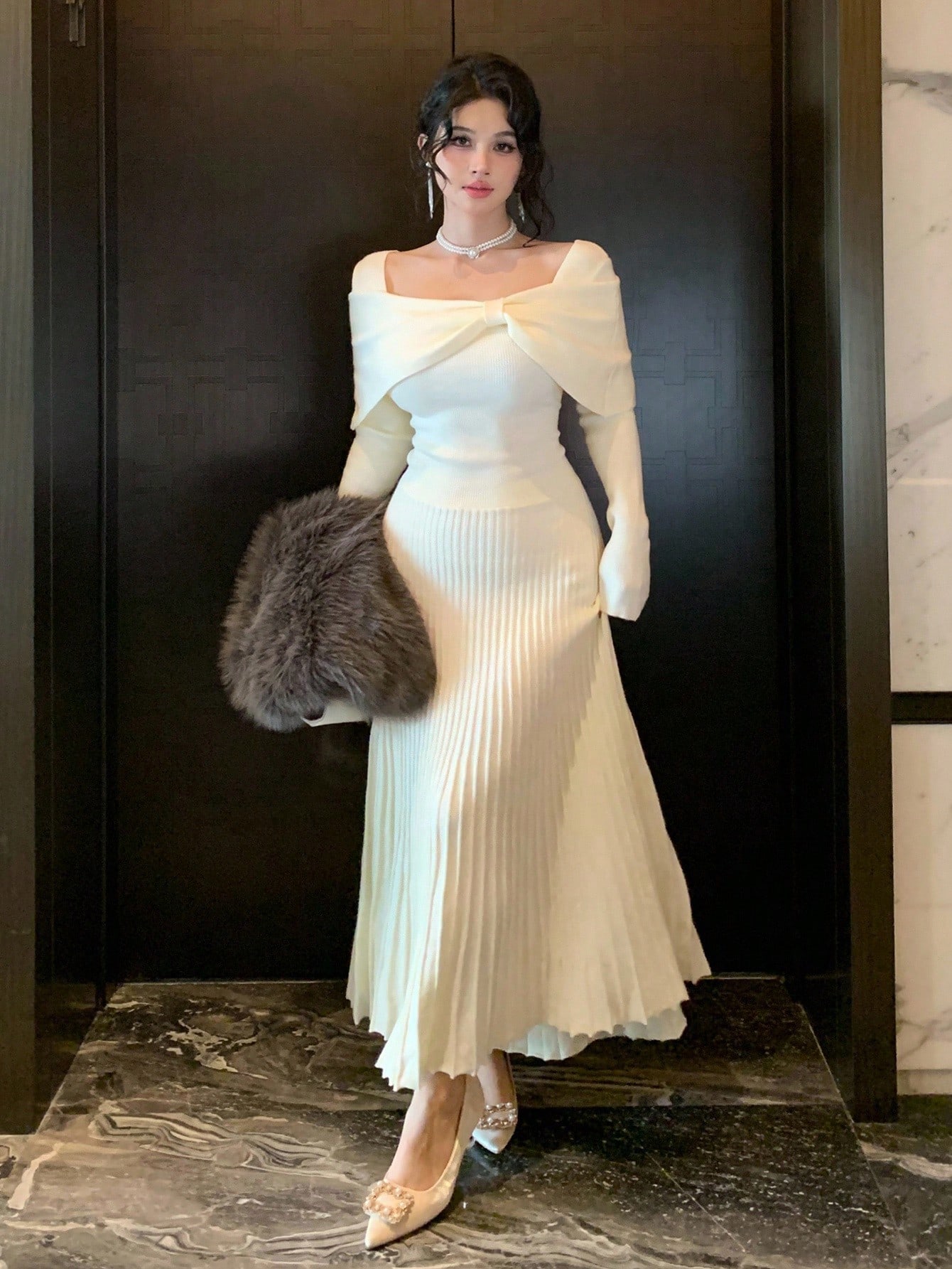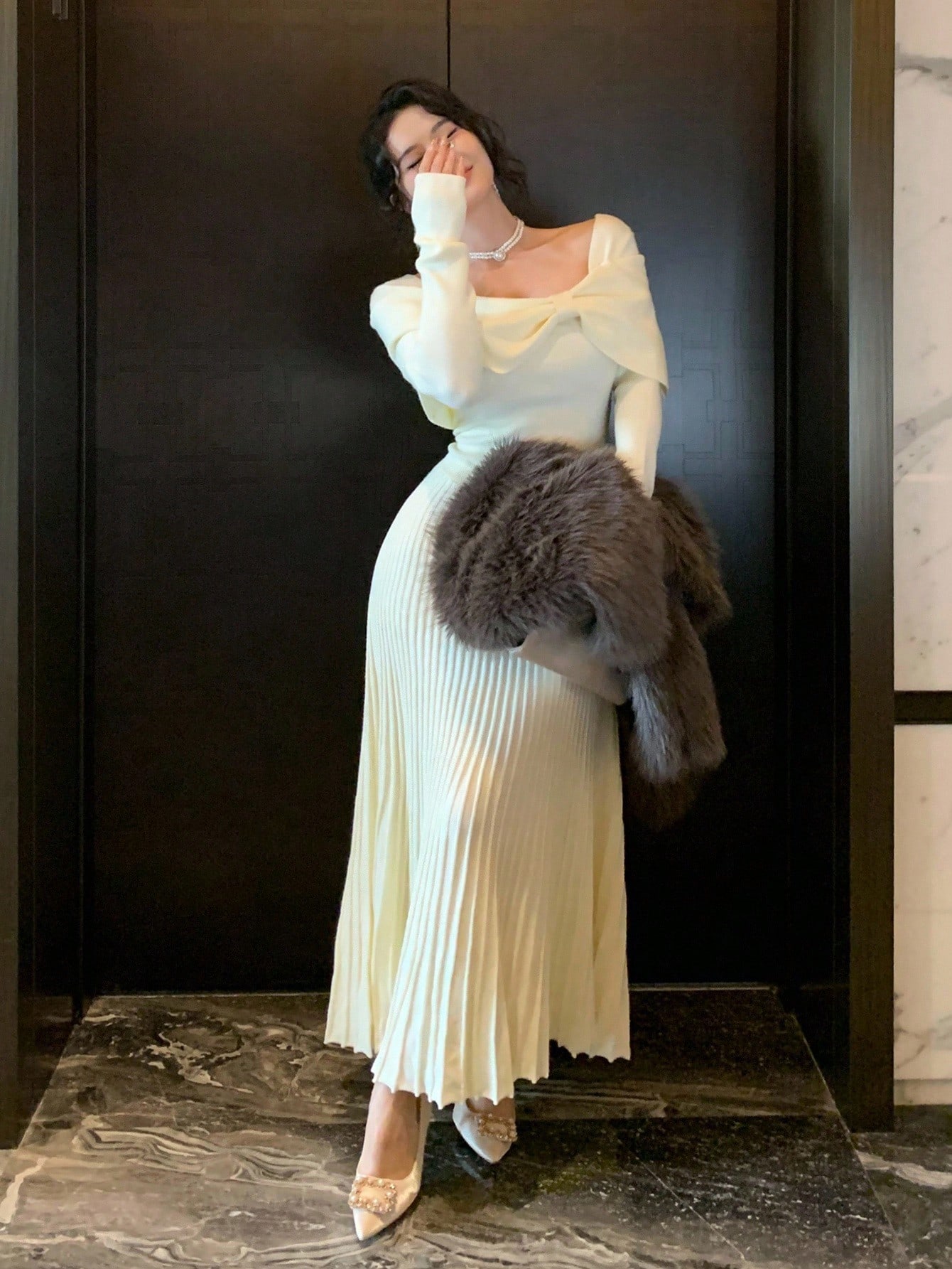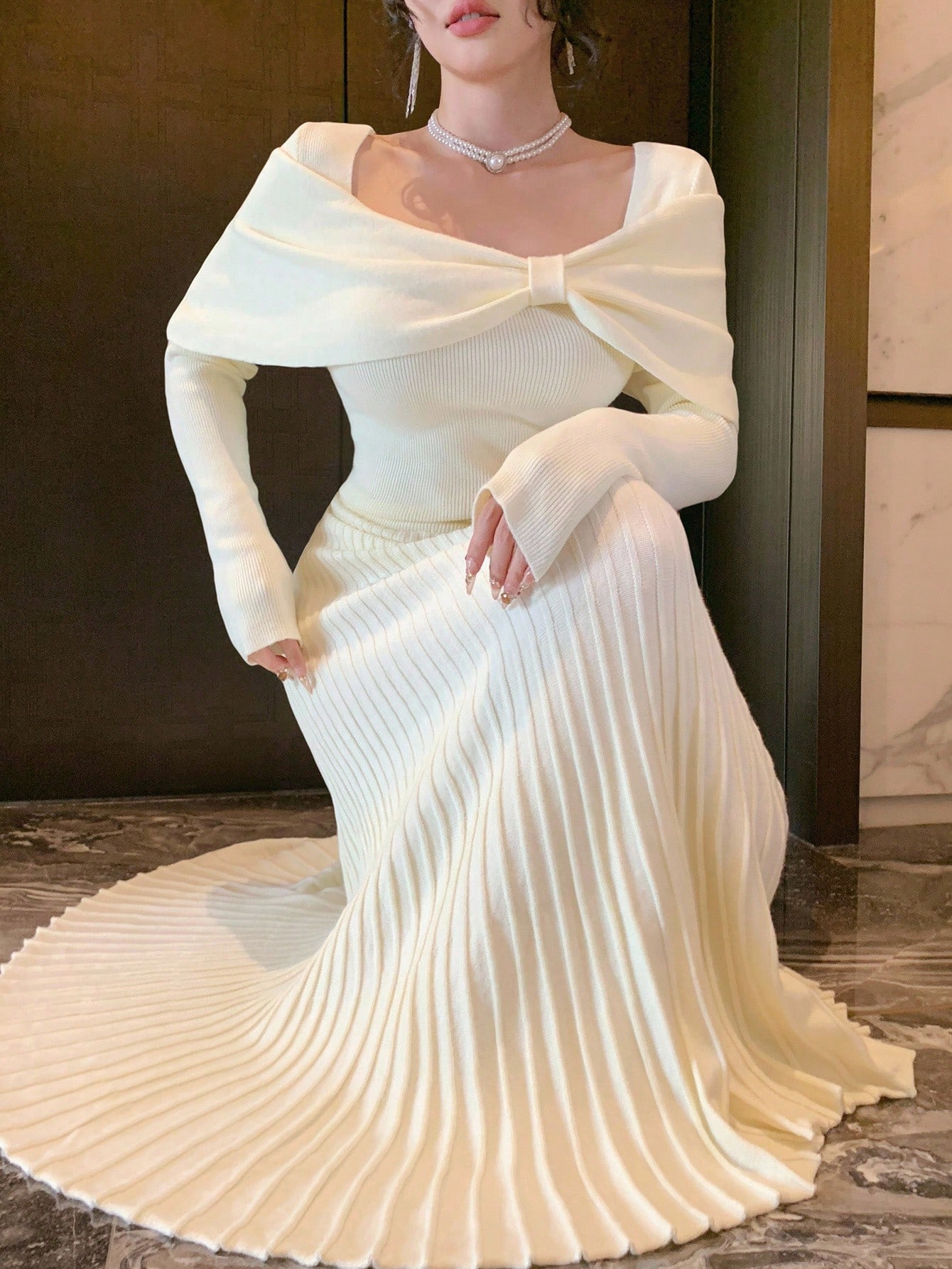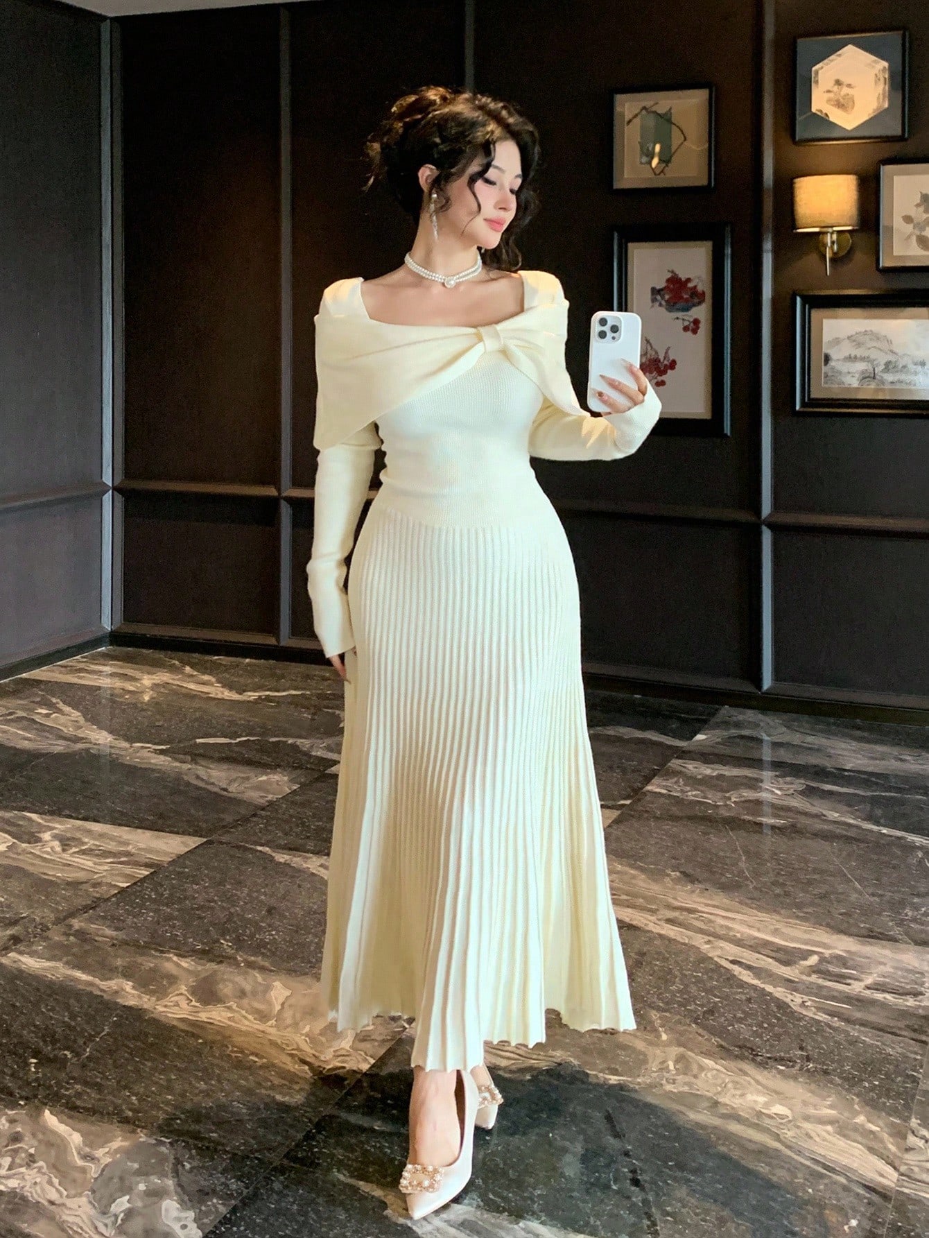فستان كنزة صوفية أنيق بلون أحادي الرقبة المربعة غير متماثل، خريفي